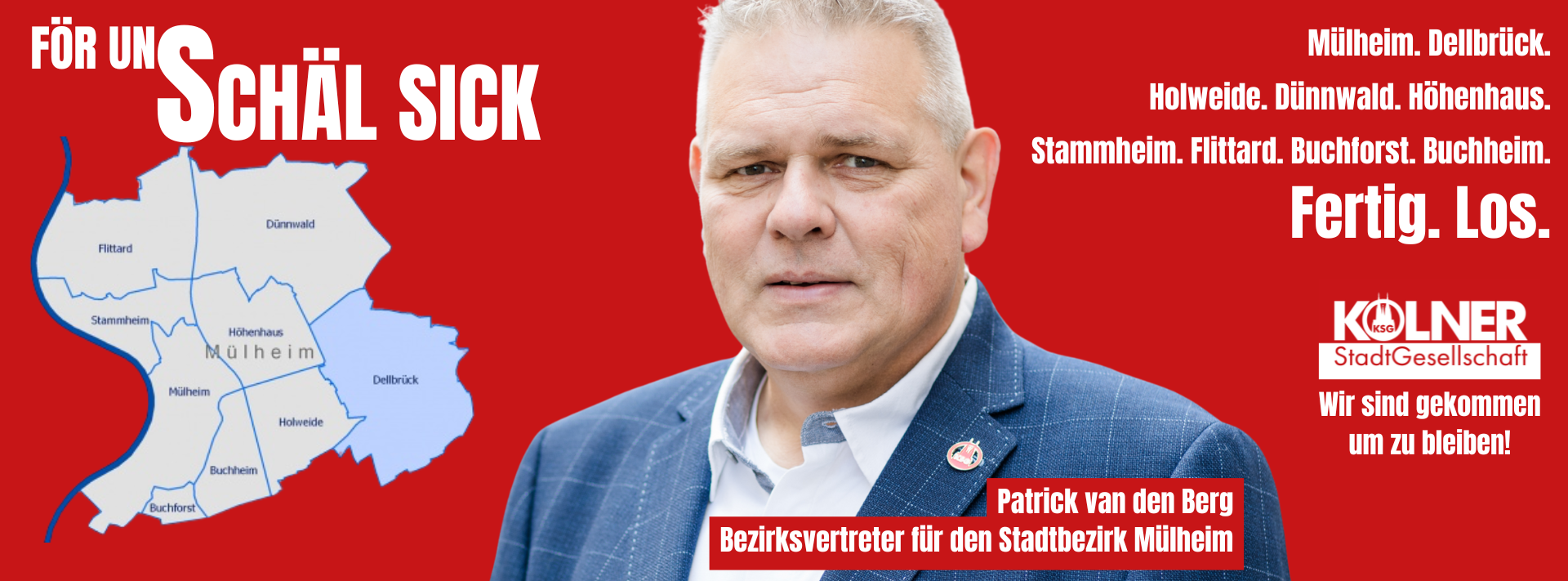 Mein Name ist Patrick van den Berg, 55 Jahre alt, in Köln-Hohenlind geboren und in Dellbrück aufgewachsen. Gemeinsam mit meiner Patchworkfamilie, zu der drei Kinder und zwei Hunde gehören, lebe ich mit großer Verbundenheit in unserem Veedel.